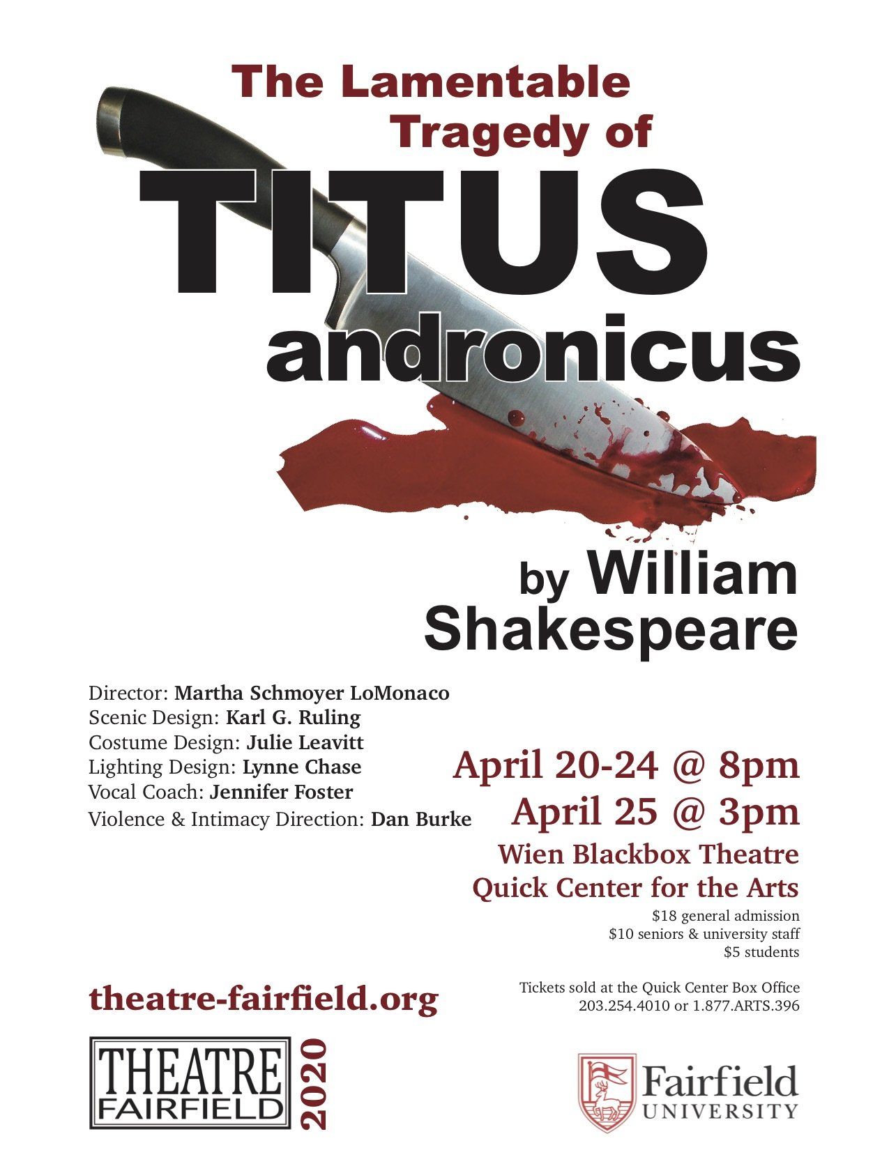 Thanks to everyone who has contributed to Titus Online, especially Theatre Fairfield’s terrific production interns (all of whom are also part of the show!): Kiersten Bjork, ’21, Carlin Fournier, ’22, Kierstin Jones, ’21, Park Lytle, ’21, Samantha Millette, ’20, and Fallon Sullivan, ’20, along with our wonderful webmaster, Maddie Dutilly, ’22.