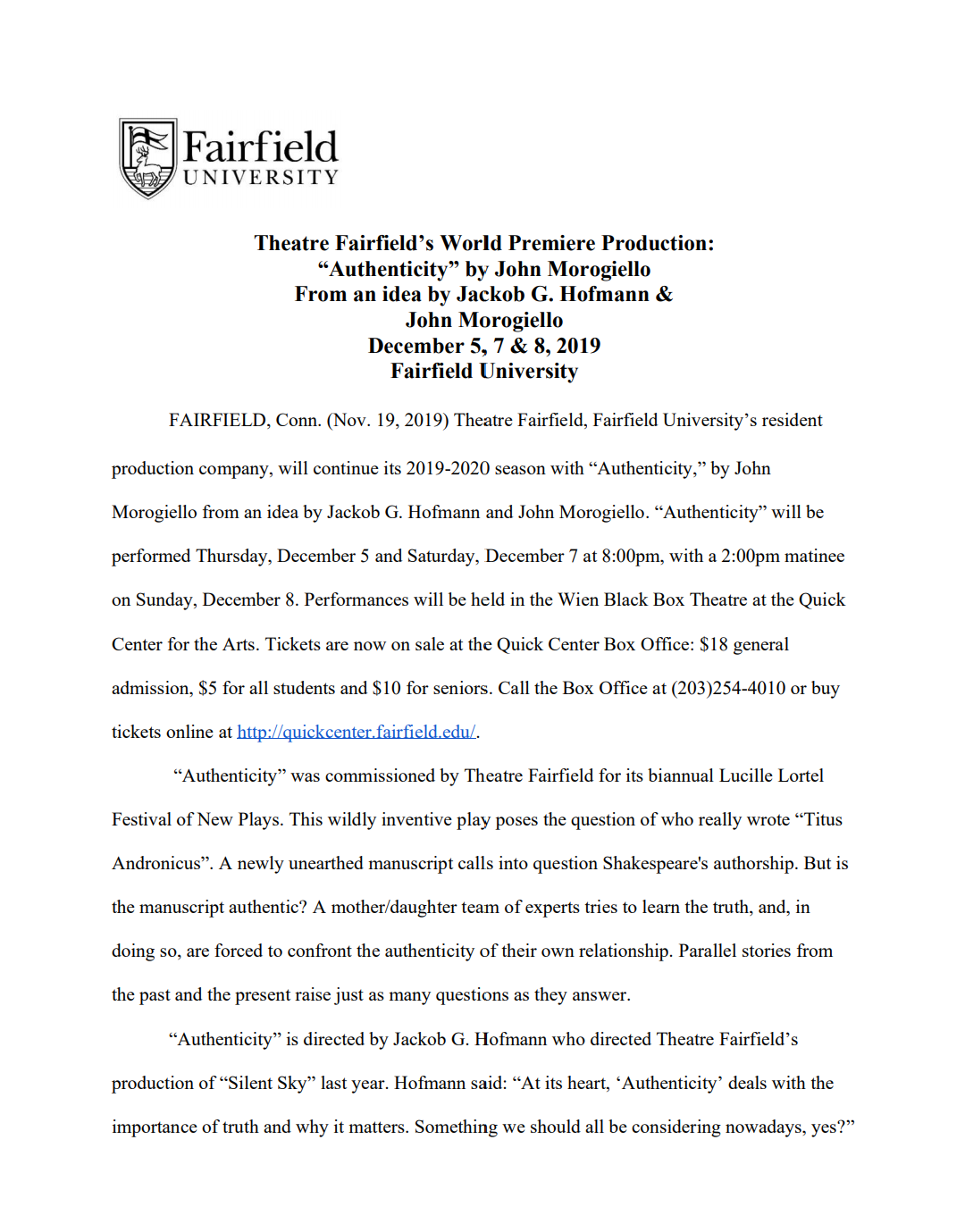 Theatre Fairfield is excited to perform the World Premiere of Authenticity; script by John Morogiello from an idea created by John Morogiello and Jackob G. Hofmann, the play’s director. This production is a staged reading. What IS a staged reading? Read our Director’s Note below: