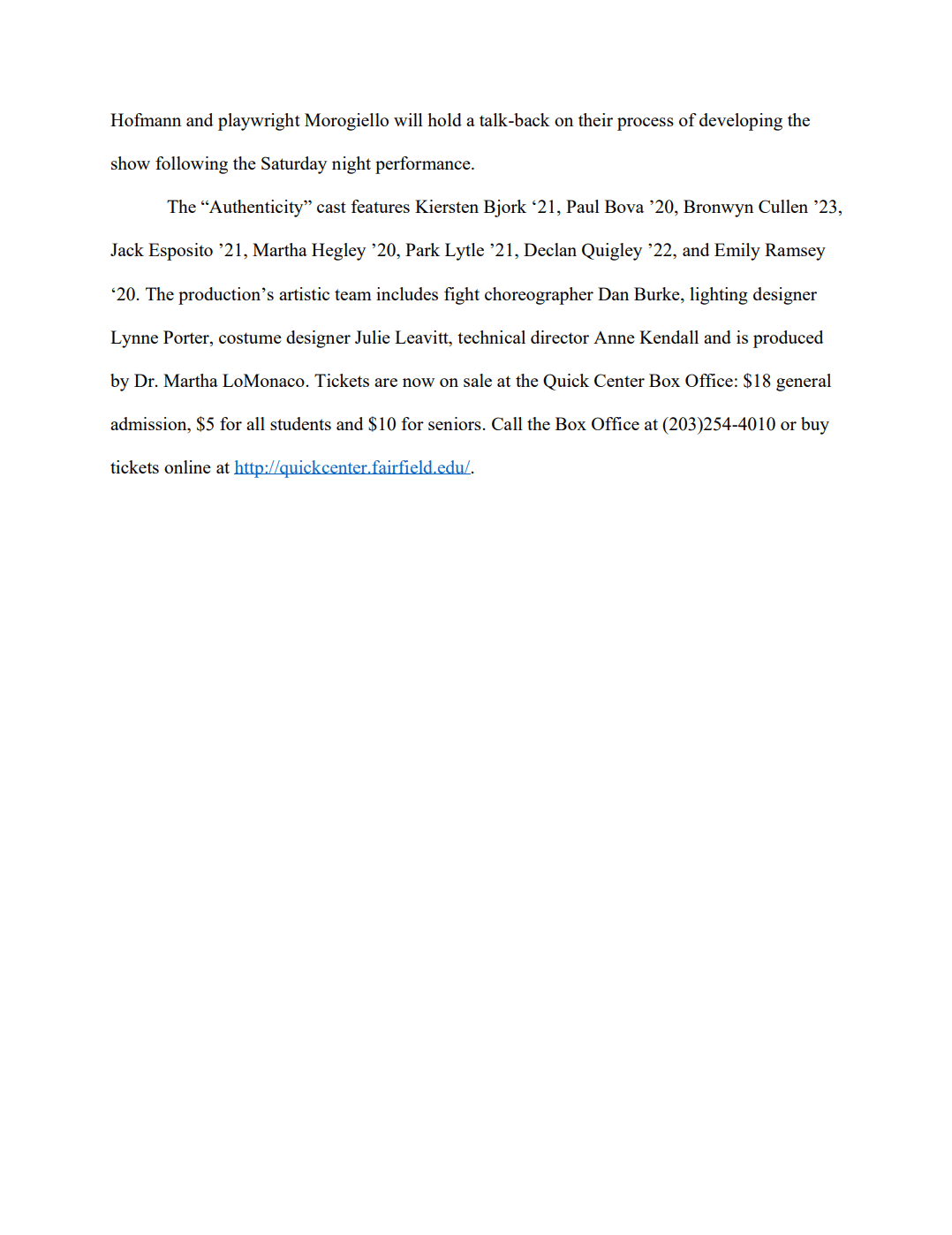 Buy Tickets on the website for the Quick Center of the Arts: