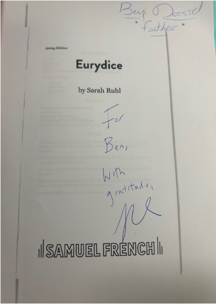 Ruhl is currently enjoying a Signature Theatre Playwrights’ Residency where Letters from Max is still running. A staged reading of Eurydice, with the original director, Les Waters, at the helm will be presented for the Signature’s 2023 Gala on April 23, the day after our production closes. The cast also had an opportunity to meet her and Eurydice actor, Ben Dressel, who plays the Father, had his script signed by Ruhl. When we met her, Ruhl hinted that a major new production of Eurydice may be forthcoming; we think the reading may